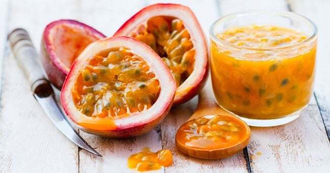 Le fruit de la passion (alias Passiflora edulis) est un fruit tropical sucré et riche en graines. Il est légèrement ovale, avec une peau externe soit jaune soit violet foncé lorsqu’il est complètement mûr. Le fruit de la passion jaune est plus gros que le violet, mais la pulpe de la variété violette a une odeur et une saveur plus intenses, elle est moins acide et donne plus de jus.